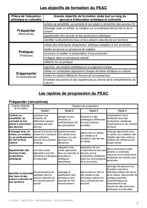 Quelques principes pour penser et construire le PEAC : - Egalité d’accès - 3 piliers : rencontres, pratiques, connaissances - Cohérence à l’échelle du parcours de l’élève - Progressivité - Diversité et pluralité (8 domaines : arts visuels et patrimoine / cinéma-audiovisuel / culture scientifique technique et industrielle / Histoire et mémoire / livre et lecture / Education aux médias / musique / spectacle vivant) - Partenariat - Place de l’élève